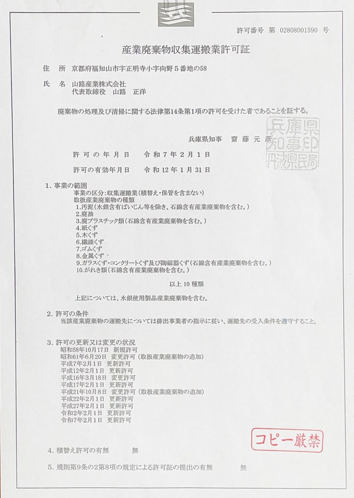 兵庫県産業廃棄物収集運搬業許可証