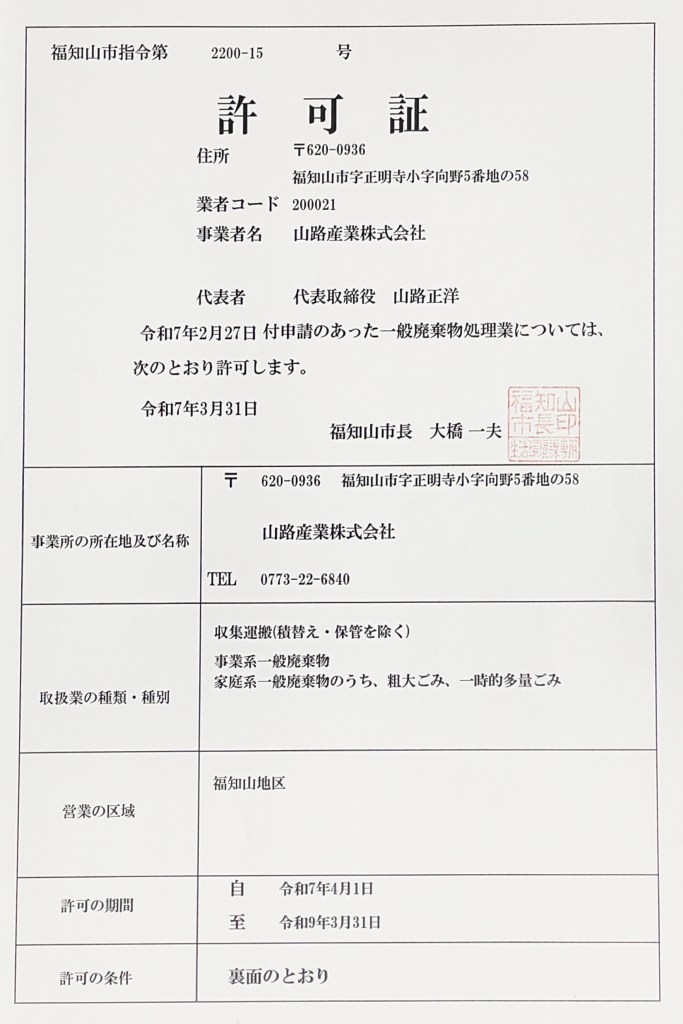 福知山市一般廃棄物処理業許可証